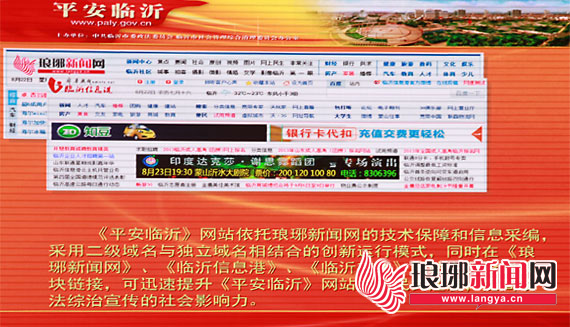 《平安临沂》网站依托琅琊新闻网的技术保障和信息采编,采用二级域名与独立域名相结合的创新运行模式,(网址:http://paly.langya.cn/;http://paly.gov.cn)同时在琅琊新闻网、临沂信息港、临沂在线的网站主页设置模块链接,可迅速提升《平安临沂》网站的网民关注度,提高政法综治宣传的社会影响力。