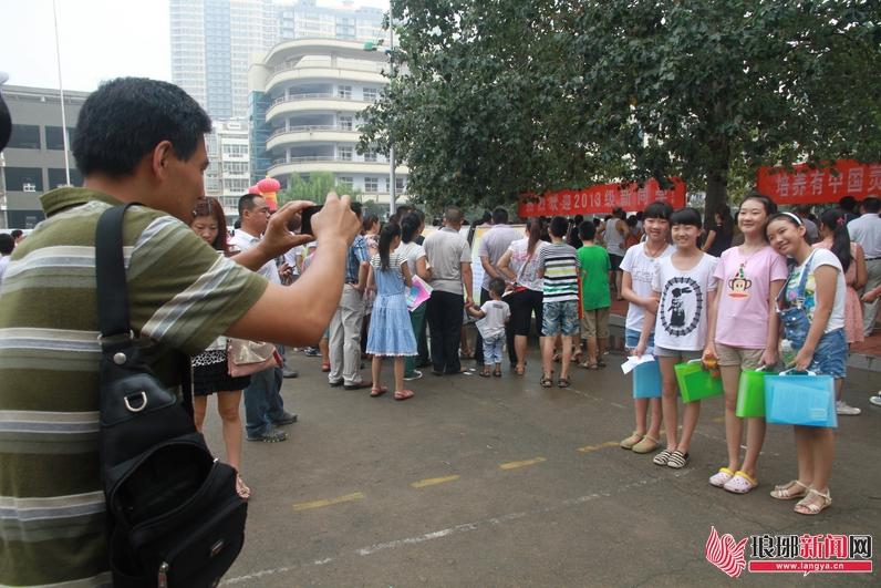 家长为新生在学校拍照留念