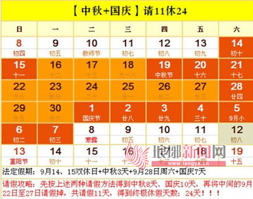 中秋节+国庆节“请11休24”的终级攻略模式:先按上面两种情况,申请中秋8天和国庆10天的假期,然后在9月22日至27日请假,共请假11天,即可享受“超值24天放假套餐”!