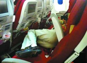 昨天清晨,一位乘客横卧在机舱内的坐椅上酣然入睡。本版摄影/本报记者 赵亢