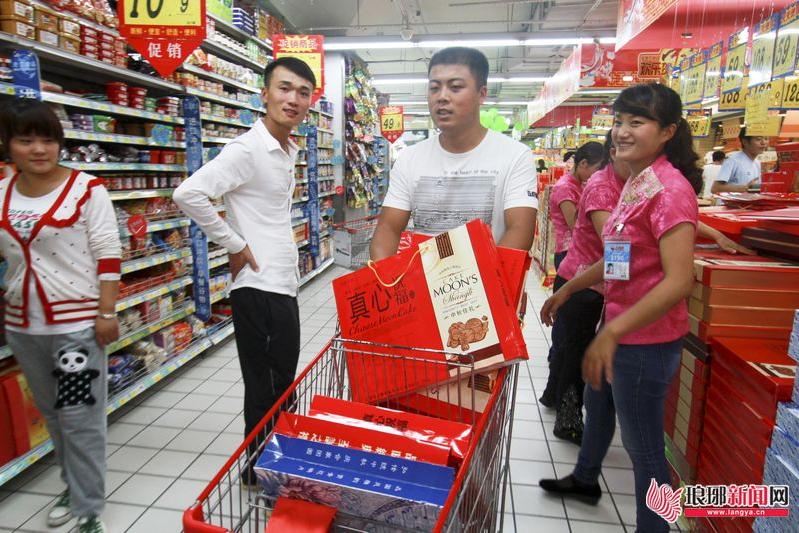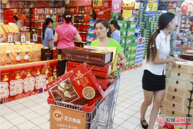 9月15日,在临沂市区一家大型超市内,一名女顾客推着满载礼品的小车走向结账台。