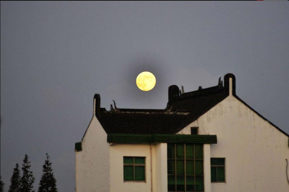 9月19日,一轮巨大的明月从上海金山的一家民居屋檐上空升起。
