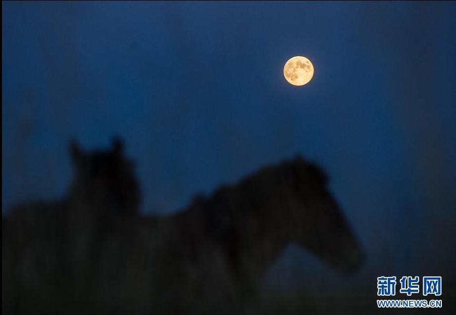 9月19日晚,几匹骏马在圆月高悬的新疆巴里坤大草原上吃草。新华社记者 罗晓光 摄