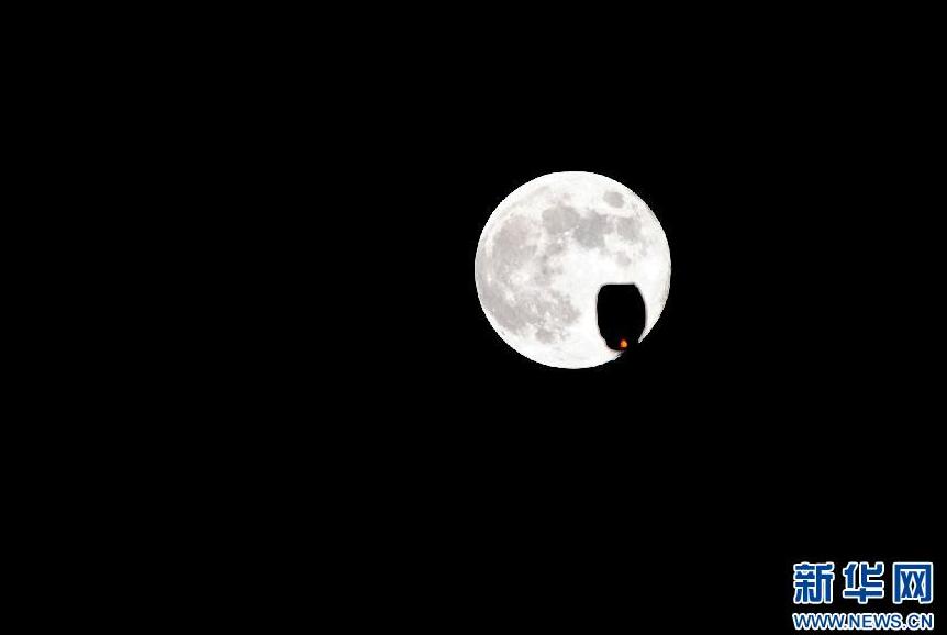 9月19日晚,在广西柳州市上空,一盏孔明灯在中秋圆月前飞过。新华社记者 黄孝邦 摄