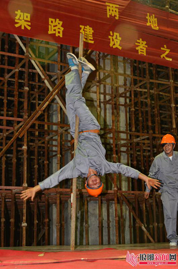 音乐响起,只见三名动作灵便的年轻建设者头戴安全帽,顺着钢管攀爬、倒立、旋转,呈现出一个个精彩的动作。