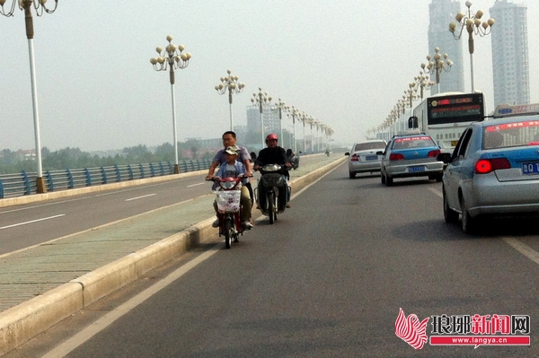 在金雀山路沂河大桥上,不时有人骑车逆行。