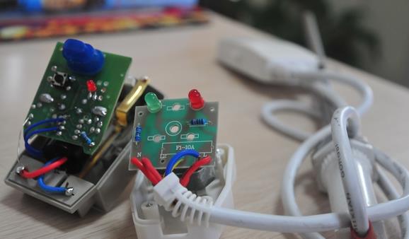 除了外观上的差别外,记者随后用螺丝刀打开两个插头查看内部构造,原来普通插头内部构造极为简单,只不过外接了两条指示灯的接线,根本起不到任何提示作用,而断电保护功能更是无从谈起。而打开漏电保护插头则会发现,内部构造明显复杂于普通插头,两根电源线(火线与中线)同时穿入一个特制的“零序电流互感器”中心孔中,在遇到特殊情况时,会起到应有的保护功效。