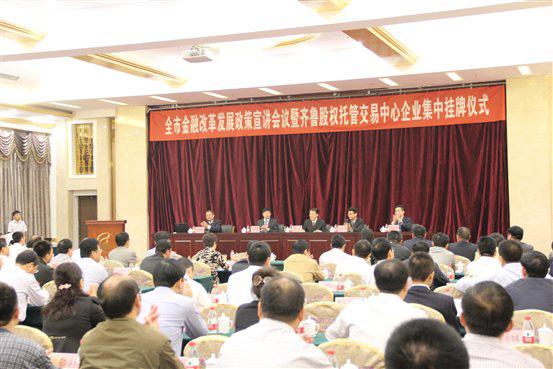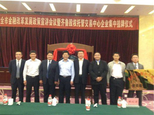 临沂网讯:9月28日上午,临沂市金融改革发展政策宣讲会议暨齐鲁股权托管交易中心企业集中挂牌仪式在颐正园隆重举行。临沂市政府副市长沈继奔、市长助理张凌霄、山东省金融办副主任张文、临沂市金融办主任王兴助、齐鲁股权托管交易中心有关负责人、市金融系统相关单位负责人和四家挂牌上市企业负责人一起与现场两百余名代表和媒体界人士共同见证了这一历史时刻。