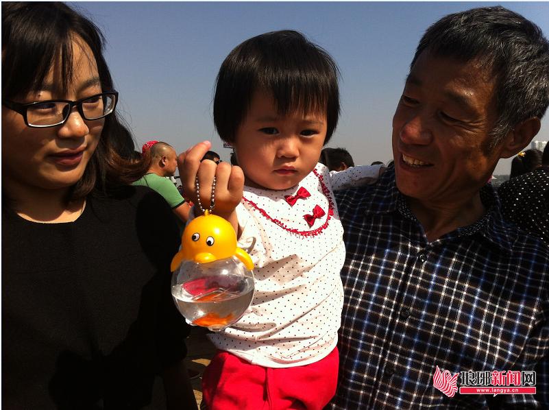 在13日自发齐聚沂河阳光沙滩放鱼的众多市民家庭中,有许多是祖孙三代一同来的,市民殷学涛则是带着孙女、女儿来放鱼。