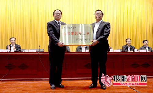 山东省委常委、统战部长颜世元向蒙阴县委书记、县人大常委会主任朱开国颁发“蒙阴县:山东省长寿之乡”的匾牌。