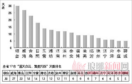据介绍,9月份,“蓝天白云,繁星闪烁”天数最多的城市是烟台,为30天,最少的是枣庄和聊城,均为5天。全省17市中,有13个市“蓝天白云,繁星闪烁”天数不足15天,其中我市“蓝天白云,繁星闪烁”天数为9天。9月份,细颗粒物浓度(PM2.5)最好的城市是威海,为29μg/e(微克/立方米),最差的城市是菏泽,为115μg/e,我市细颗粒物浓度位居第6位。