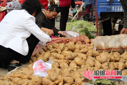 随后,记者又走访了润丰、埠村两家农贸市场。在农贸市场上,薯类品种则较为丰富,不同品种的地瓜吸引了许多市民前来购买,有红皮白瓤、红皮黄瓤的,还有黄皮黄瓤的地瓜以及紫薯等。“我这儿的地瓜品种比较齐全,紫薯不如普通的地瓜卖得好。”老家在沂南的老徐告诉记者,地瓜上市有半个月了,眼下正到了销量递增的黄金时期,红皮地瓜的收购价在0.6—0.7元/公斤,黄皮的1元/公斤,红皮黄瓤的则较贵在一块钱左右。为了提高整体的销量,老徐的地瓜,不管红皮的还是黄皮的统一售价1.5元/公斤,个头较小的则卖0.6元/公斤,由于价格优惠,老徐的地瓜吸引了不少市民。