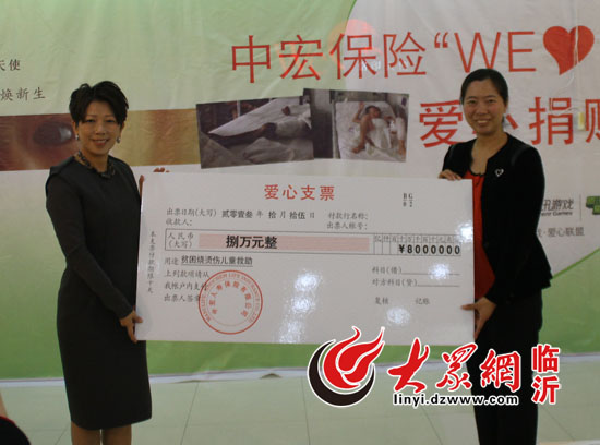临沂市保险协会会长孙光毓对中宏保险临沂机构在临沂地区的发展予以概括,对中宏保险的公益事业予以肯定和鼓励。随后,中宏保险副总裁黄婉梨女士向天使妈妈基金会邱莉莉交接8万元支票,与会人员与被救治的烧烫伤儿童和家长合影留念。