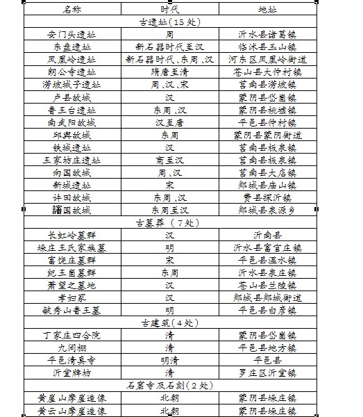 在公布的全省606处文化遗址中,临沂市共有31处文化遗址入选。其中有沂水的安门头遗址、临沭的东盘遗址等古遗址15处,沂南的长虹岭墓群、沂水的垛庄王氏家族墓等古墓葬7处,蒙阴的丁家庄四合院等古建筑4处,蒙阴的黄崖山摩崖造像等石窟寺及石刻2处,沂南的常山庄山东省青代会会址等近现代重要史迹及代表性建筑2处和其他目录中的郯城县广福寺银杏园。