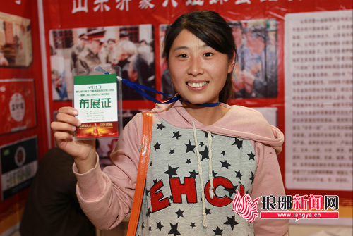 沂蒙六姐妹食品有限公司的布展人员向记者展示布展证。记者 梅鲁生摄
