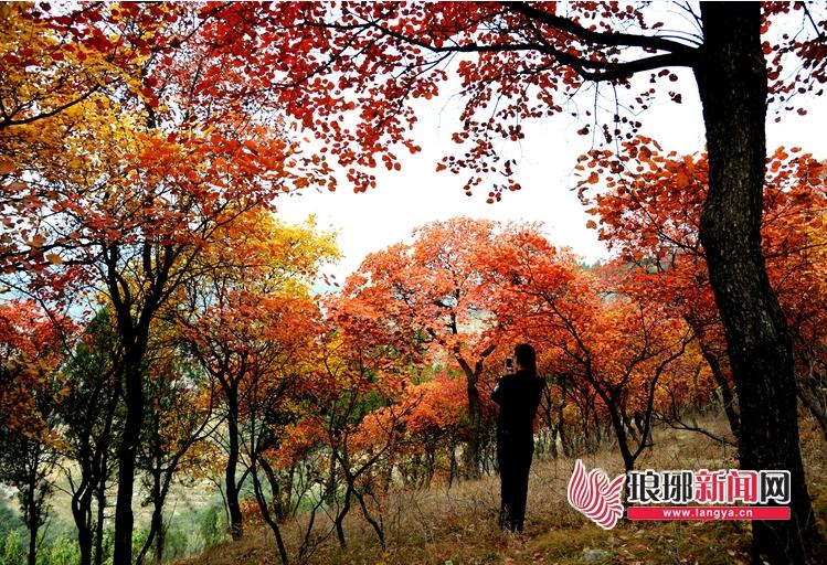 10月30日,在以往的季节里红叶等霜降过后一周就早已凋零,而今年由于天气暖和、少雨、少霜冻的缘故,地处沂蒙山腹地的蒙阴县素有中国第五大造型地貌——岱崮地貌的岱崮镇北一处名叫封山的山凹里,近万株五角枫、红栌、黄栌等正姹紫嫣红,吸引了不少游客前来游“崮乡”,赏红叶。图为10月30日,游客在红叶林中赏美景。