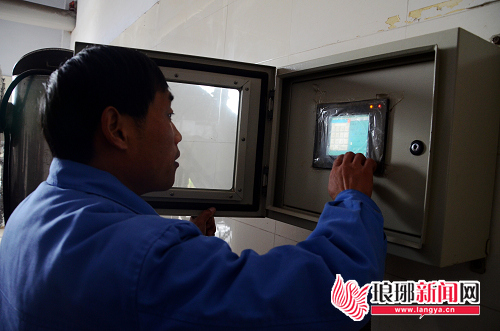 工作人员正在对触摸屏上的数据进行操控