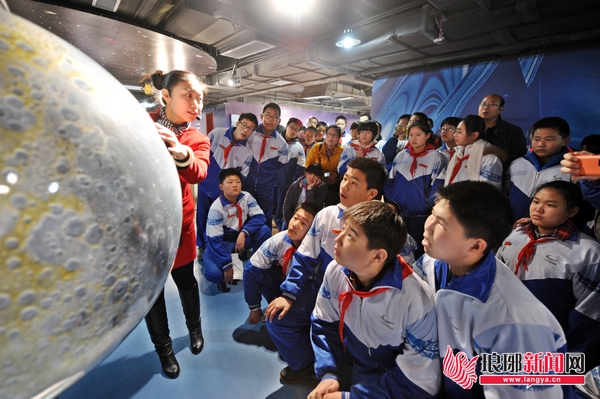 第一次参观市科技馆的临沂六中北校区七年级一班学生庄译丹每到一处展品前,都会详细地记下相关的介绍,她说:“我从小就对天文知识感兴趣,最近咱们中国的‘玉兔号’月球车即将在月球着陆,我今天在月球模型上找到了着陆位置——月球虹湾区。”当天,首批青少年天文科普之旅的小客人们——来自临沂六中北校区的学生们在辅导老师的带领下,详细参观了天文展厅、球幕科普影院(天象厅)和天文观测台等展馆,对天文科学知识有了一次直观的了解。
