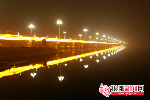 8日晚,雾霾让临沂市区金雀山沂河桥呈现水雾一色景象