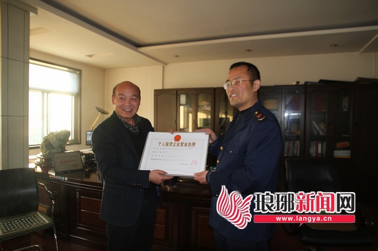 通过绿色通道,临沂市河东区英大五金商行用一天的时间就完成企业注册。图为工商局工作人员将营业执照送到总经理褚延运手中。
