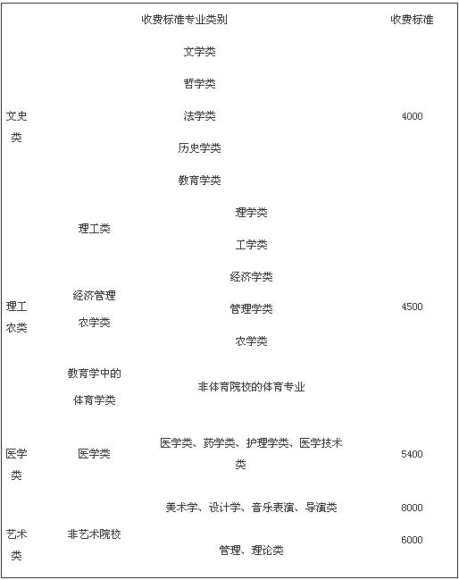 通知还具体明确了每一类专业的收费标准,其中大多数专业类别的学费都有较大幅度上涨。文史类每生每学年由现行3400元调整为4000元,其中外语类由现行4800元调整为4000元。理工农类中的理学类、工学类、农学类由现行3600元调整为4500元,经济学、管理学类由3400元调整为4500元,非体育院校体育专业由现行4800元调整为4500元。医学类由现行4000元调整为5400元。非艺术院校艺术专业由现行6000元调整为8000元。艺术院校艺术专业、体育院校体育专业、中外合作专业、校企合作专业按现行政策执行。