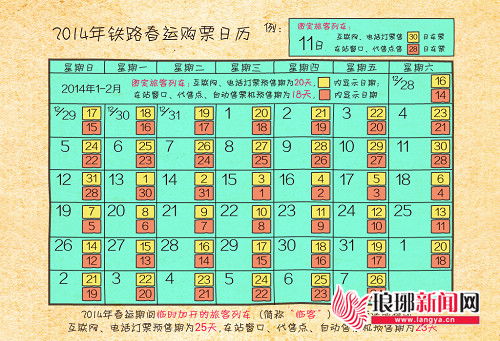 另据了解,除临客外,互联网、电话订票预售期为20天,即2013年12月28日发售2014年1月16日车票;车站窗口、代售点、自动售票机预售期为18天,即2013年12月30日发售2014年1月16日车票。