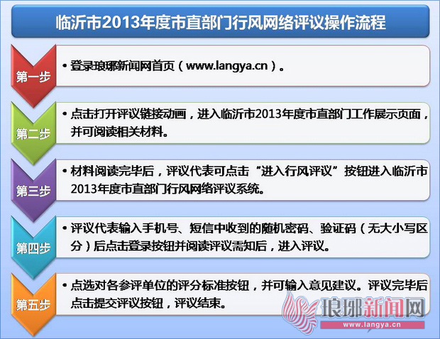 从12月25日起,行风评议网络平台将随机向参评代表发送密码,参评代表可以在有效期内凭手机号码和密码登录本网,点击行风评议专栏(http://hfpy.langya.cn)进行网上投票,并对临沂市直部门的工作提出意见建议。为便于参评代表全面了解部门情况,增强评议的针对性,临沂市纠风办将市直经济管理、社会管理、行政执法、公共服务、金融保险等5大类别的百余参评部门、单位的工作职责、工作情况和服务承诺统一在琅琊新闻网公开,参评代表评议时可以点击浏览。