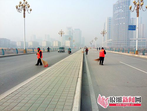 市园林局保洁人员正在清理桥面