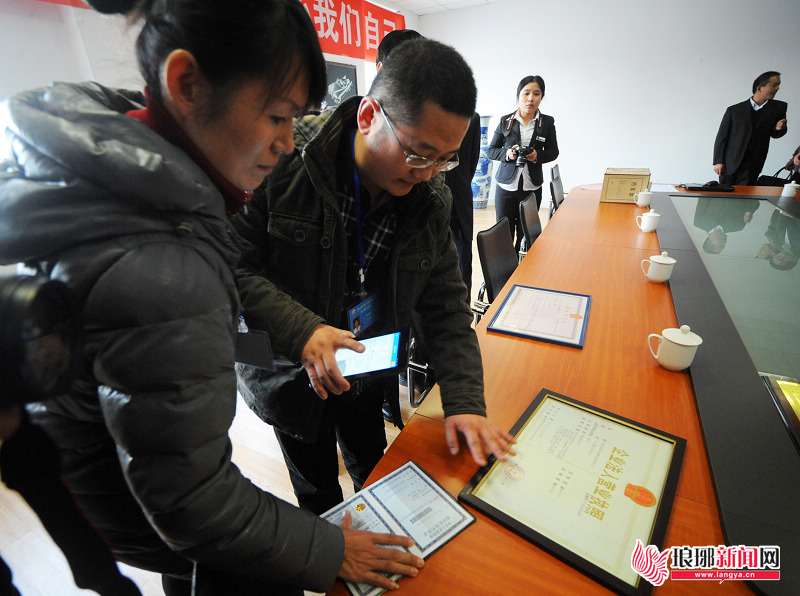 市统计局经济普查工作人员在使用PDA对企业进行数据采集