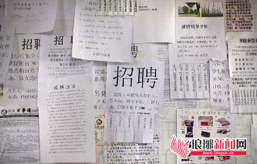 临沂大学里的张贴板上贴满了招聘信息
