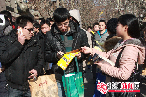 上午的考试结束后,培训机构的工作人员在向走出考场的考生们发放宣传资料