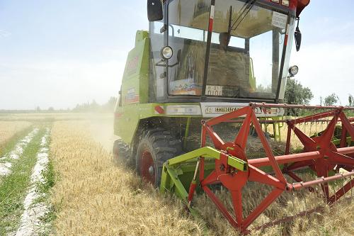 6月17日,一台联合收割机在新疆喀什疏勒县英阿瓦提乡喀帕村麦田里收割小麦。据农业部网站消息,截至6月16日17时,全国已收获小麦2.81亿亩,进度达八成,其中机收2.42亿亩,机收率86.1%。新华社发(邹建奇 摄)