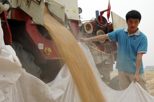 6月17日,山东省聊城市东昌府区朱老庄镇许堂村村民许晓星在收获小麦。 新华社发(张振祥 摄)