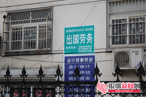 农民工的情况让不少“黑心”中介钻了空子。7日,在临沭县城的路边,甚至是个别小区的居民楼玻璃上,都可以见到“出国”“劳务”等字样。8日,在市区一些写字楼内,也能看到挂着“出国劳务”牌子的中介公司。