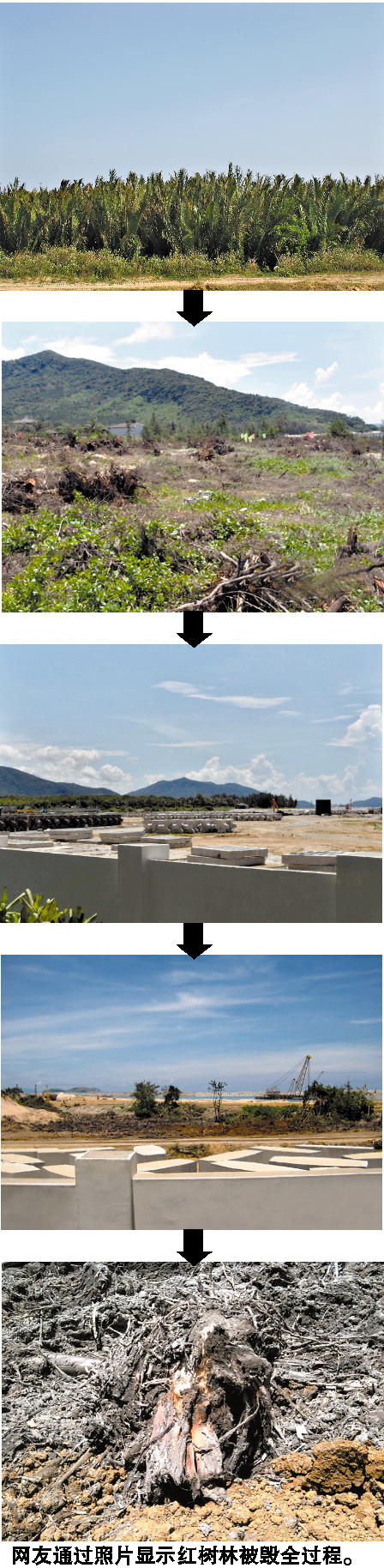 已过退休之年的刘福堂是河北人,他在电话中表示,早在几年前他就开始关注青皮林和红树林的保护,亲手提交的相关毁林事件有几十起。但到了这次现场,他还是惊呆了,“一百多亩的工地连一棵树也不見,只有两辆挖掘机,还有人用锯在砍树。”