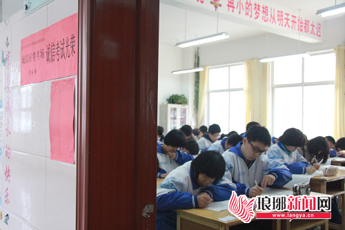 上午9点,记者来到临沂九中的诚信应考考场门前,和以往常见的考试有所不同,这一次,考场内没有监考老师的身影,黑板上写着“诚信考试,从我做起”,考场外标注了醒目的“诚信考试光荣”的字样,并且在墙上张贴了参加考试的学生名单。透过门缝,记者看到,考场内没有任何异常动静,所有学生都保持着埋头写字的姿势,偶尔有人抬起头来揉揉眼睛。