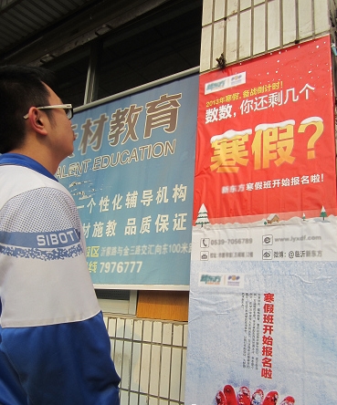 随后,记者来到银雀山路与刘家园街交会处往北10米处的“辅导一条街”,各类培训学校早已在门口纷纷贴出“寒假班开始报名”的通知。走访中,记者了解到,多数寒假补习班已招满学生。