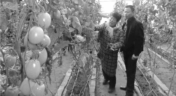 李士超(右)指导农场中的工人护理圣女果生长