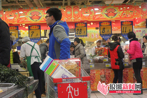 超市年货大街“火”了!大到家具家电,小到干货酱油醋,前来购物的市民不把手推车装得满满的决不罢休。