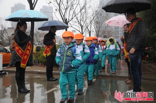 家长志愿者冒着雨雪,在开学第一天为小学生们护航。