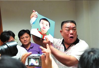 乐乐叔叔举着孩子遗像,指责凶手丧尽天良。