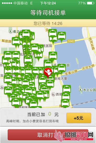 随后,记者又来到金雀山路一处公交站点,取消订单后重新下单,结果又等待了10分钟,仍没有一辆车接单。记者发现,在该处公交站点,差不多有10人正攥着手机焦急地看着过往的出租车。“今天‘快的’怎么了,我都等了十多分钟了,还没人接单。”“是啊,我这也等了5分钟了,一辆车没来,空车这么多,难道都不接单了?”又过了几分钟,其中一些人招手拦车离开。