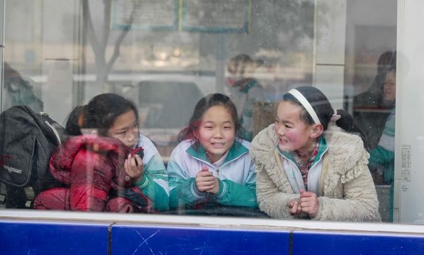 放学后,三名小学生在传达室里等待自己的家长。