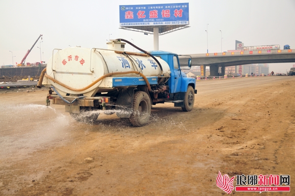 在市沂河路西外环立交桥项目现场,洒水车每天都将不定时进行降尘处理