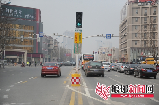 5日上午9时许,记者在金雀山路与沂州路交会处看到,在可变车道入口处,已经设置了信号灯和指示牌,对于该如何进入可变车道进行了提示,当车辆行至此处时,多数都可以按照信号灯指示行驶。
