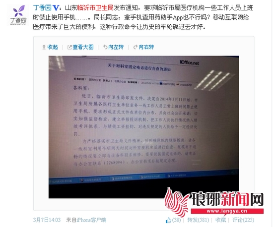 3月7日,名为“丁香园”新浪微博用户发布一条微博:“山东临沂市卫生局发布通知,要求临沂市属医疗机构一些工作人员上班时禁止使用手机……”这条微博还配有一张图片,图片内容为临沂某医院的一张题为《关于对科室固定电话进行自查的通知》的截图。