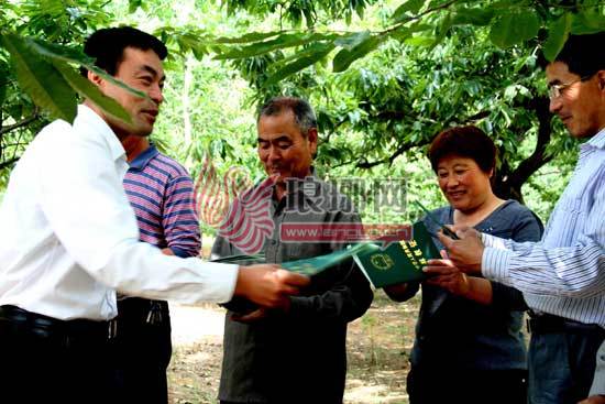 6月18日,山东省郯城县郯城办事处后东庄村王庆堂(右三)等七户承包栗园的农民从林业局工作人员手中接过《中华人民共和国林权证》。