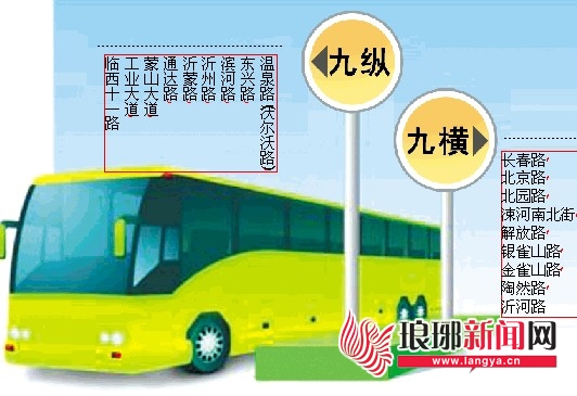 据了解,“九纵九横”公交线网规划主要是指在城市主干道上开行贯通公交线路,以直行为主。目前规划的城市主干道主要有18条,分为9条纵向车道,分别是沂州路、沂蒙路、滨河路、通达路、蒙山大道、工业大道、临西十一路、东兴路、温泉路(沃尔沃路);9条横向车道分别是沂河路、陶然路、金雀山路、银雀山路、解放路、涑河南北街、北园路、北京路、长春路。