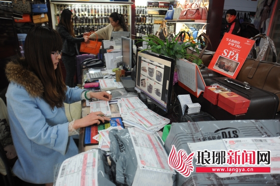 在张如修的皮具店里,店员忙着网上接单发货。