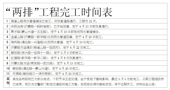 据悉,3月6日,临沂中心城区“两排”工程37处项目正式开工建设,我市2014年城建大会战拉开序幕,工程工期在2个月内,其余工程目前也已经排出了完工时间表,并将确保在今年汛期到来之前全部完工。